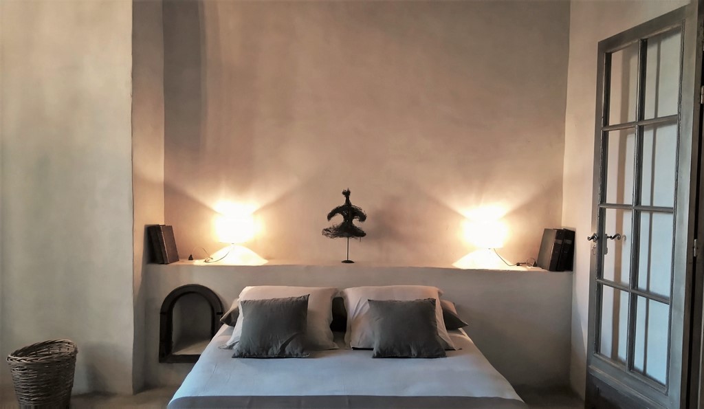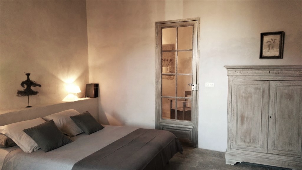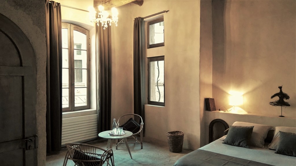 Chambre luxueuse et spacieuse de 30 m² dans une bâtisse médiévale au cœur du centre historique de Pézenas avec vue sur le clocher et l'Hôtel de Peyrat.