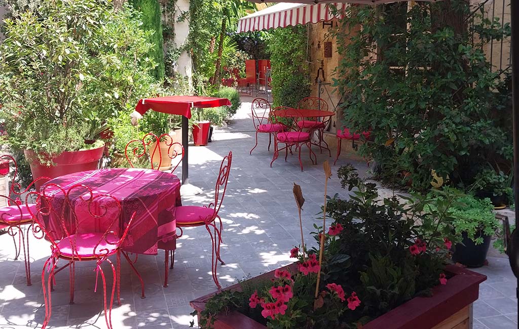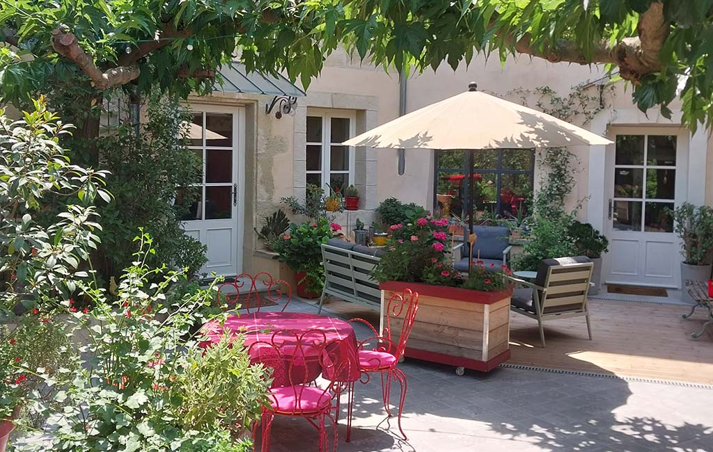 La cour extérieure, pavée et fleurie, est un havre de paix avec ses terrasses et son salon à l'ombre des mûriers platanes.