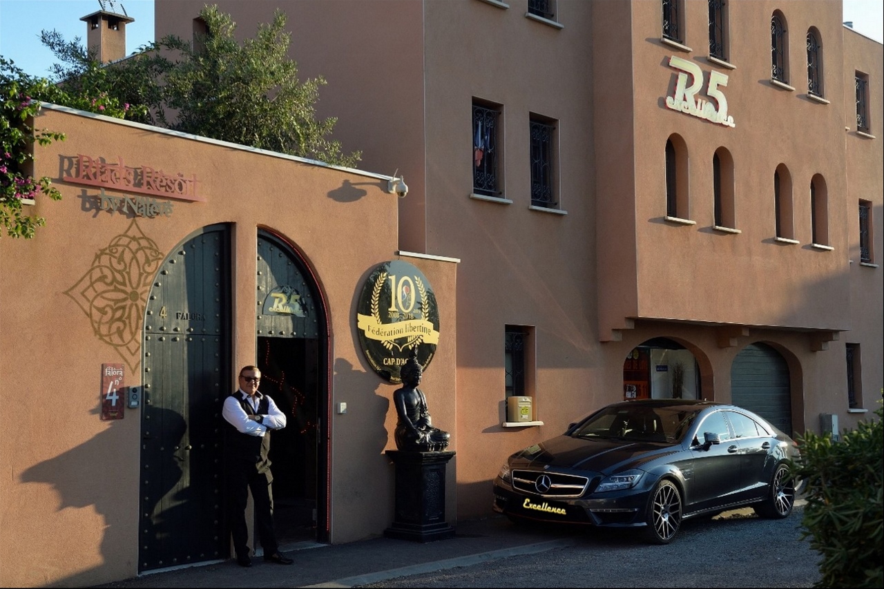 Le Riad5 est un hébergement de prestige en formule tout compris, réservé aux adultes, à 200 m de la plage naturiste. Il se compose de 2 grands pavillons indépendants sur 2 niveaux de 200 m², grand patio, bar, salon, hammam, jacuzzi, bain bouillonnant, terrasse et jardin.