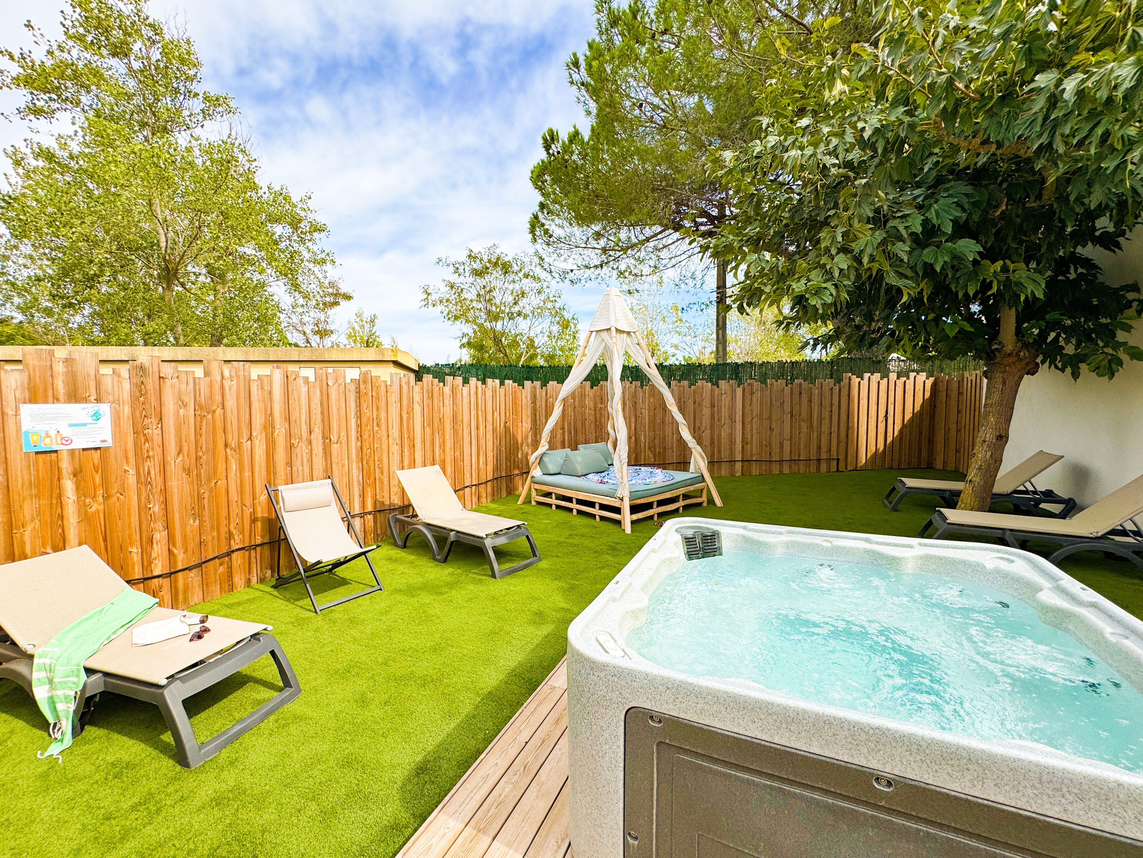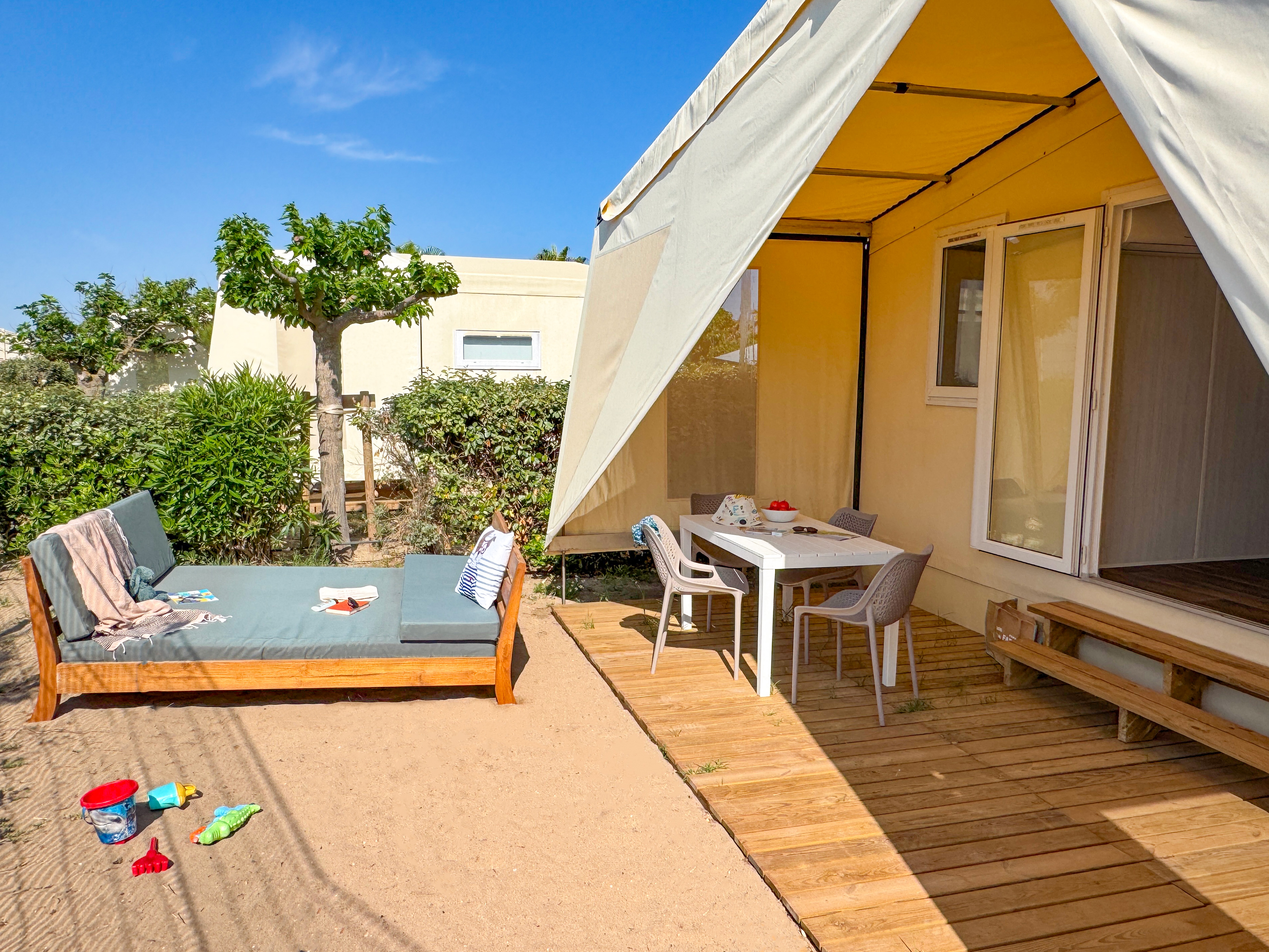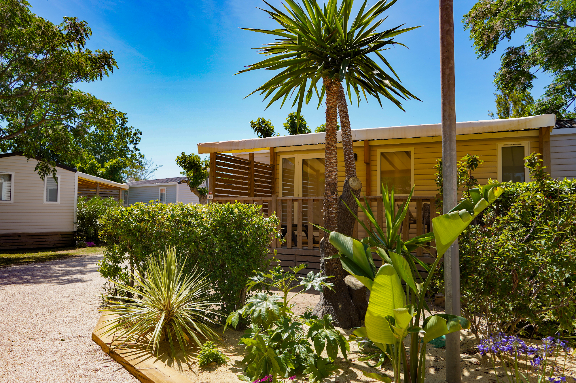Vastes emplacements ensoleillés de plus de 100 m². Location de mobil homes tout confort.