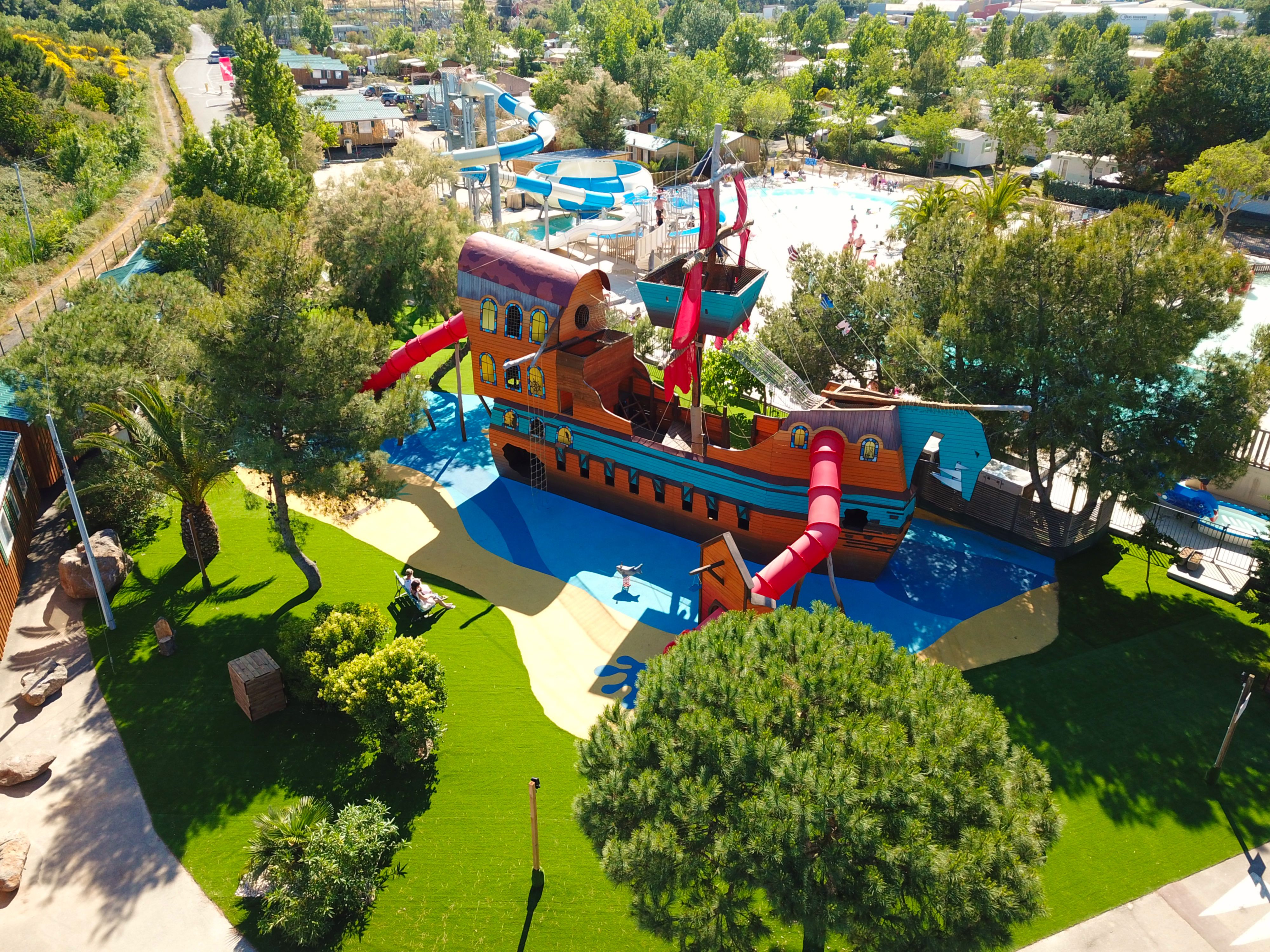 Piscines, toboggans aquatiques, animations en juillet et août, aire de jeux, boulodrome, tennis de table, terrain multisports, volley. Bar, plats à emporter.