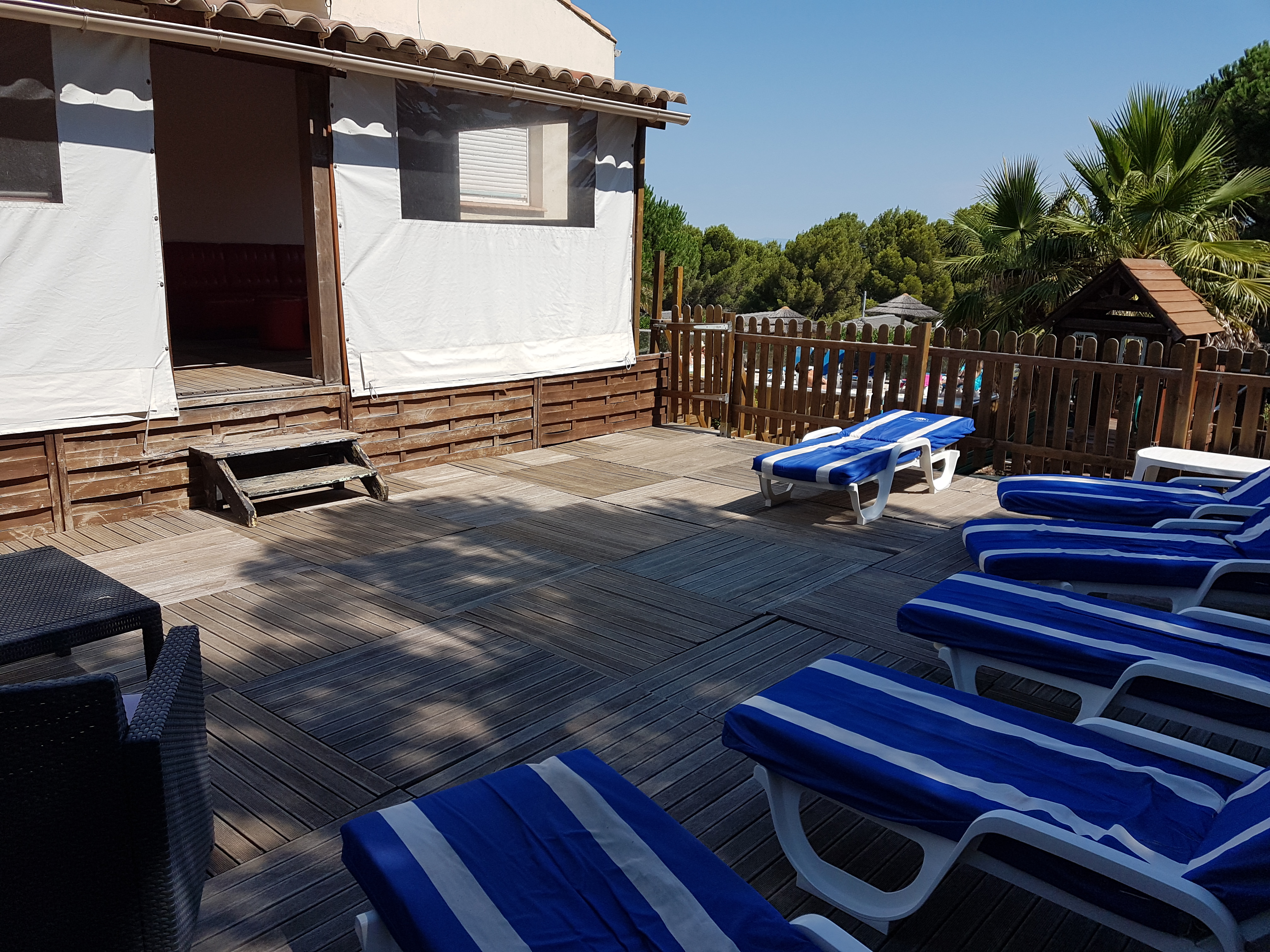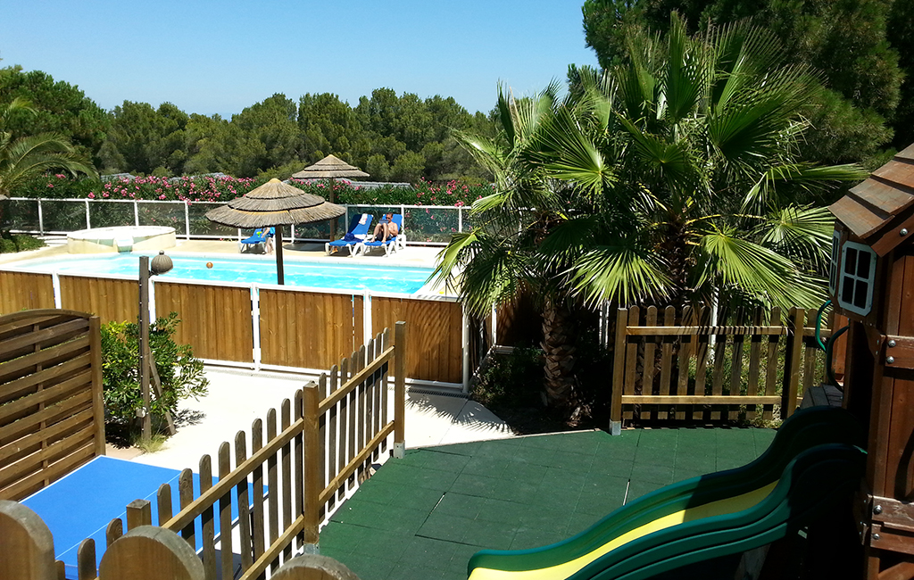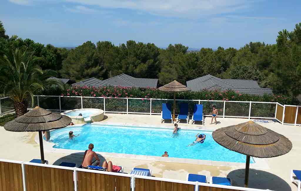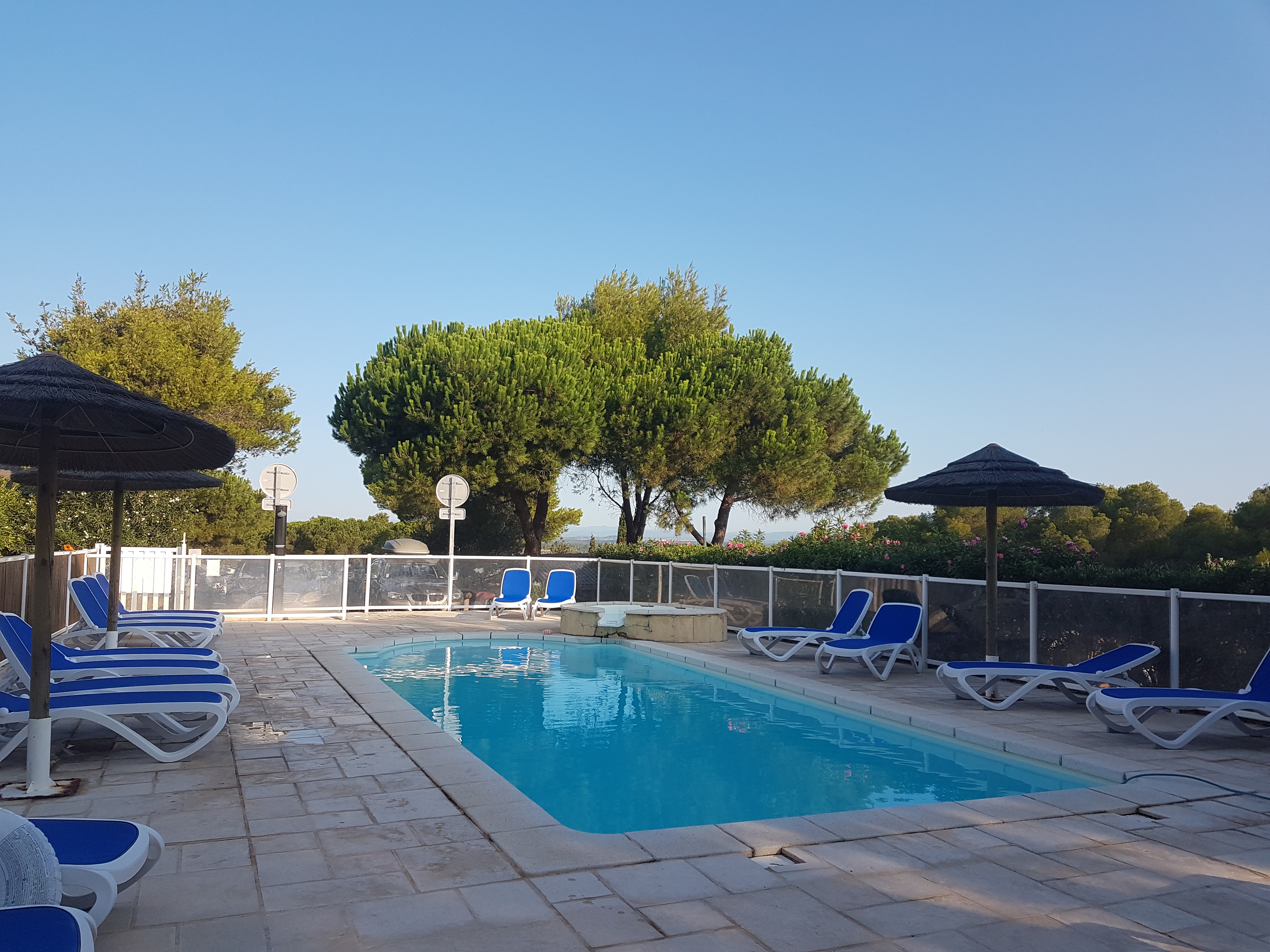 Parc Résidentiel de Loisirs situé sur le mont Saint-Loup, dans la pinède, au calme avec vue sur l'Etang de Thau et Sète au loin. Piscine extérieure chauffée. Plage à 2km (5 min de voiture). Commerces à 800 m.