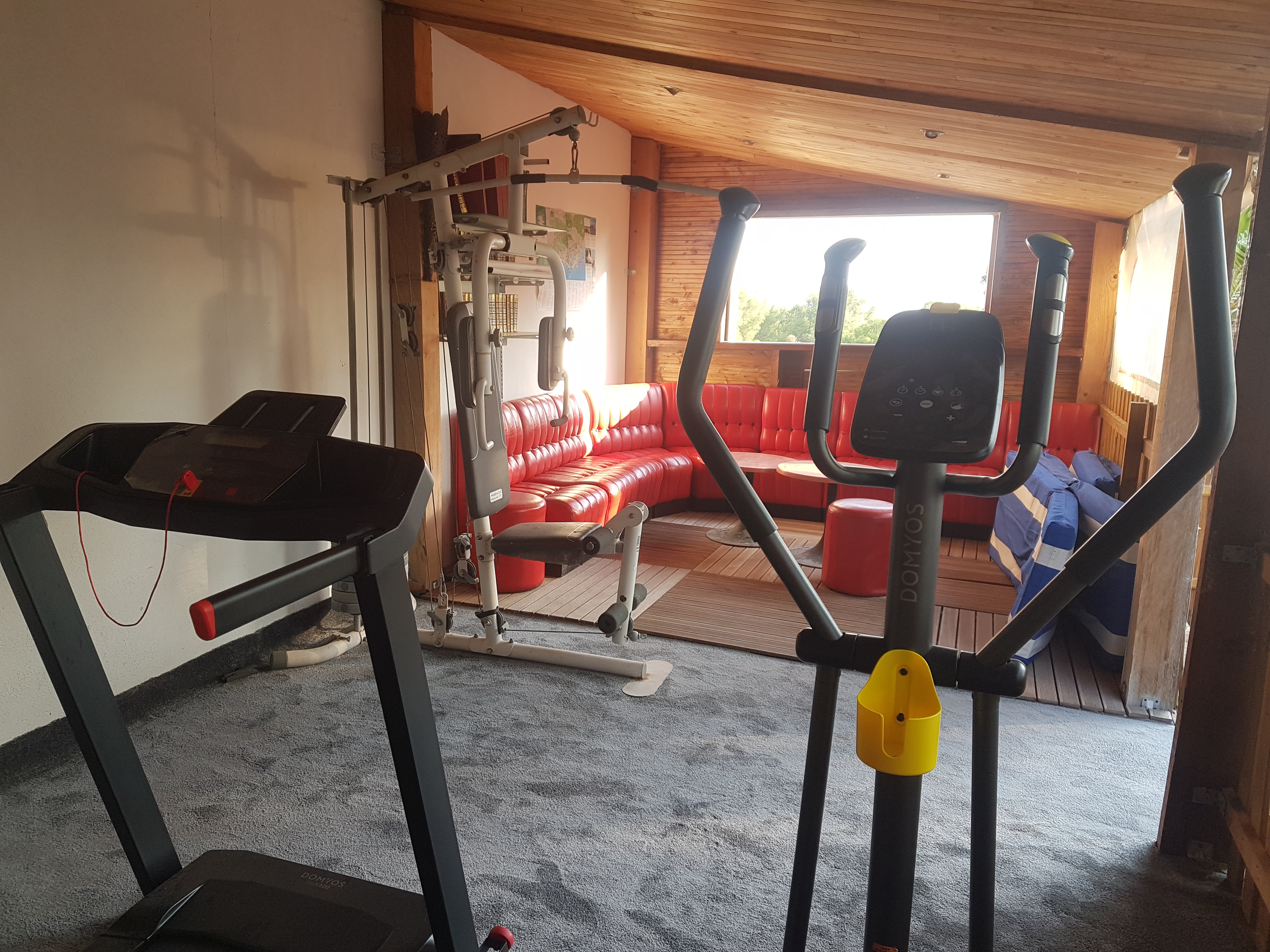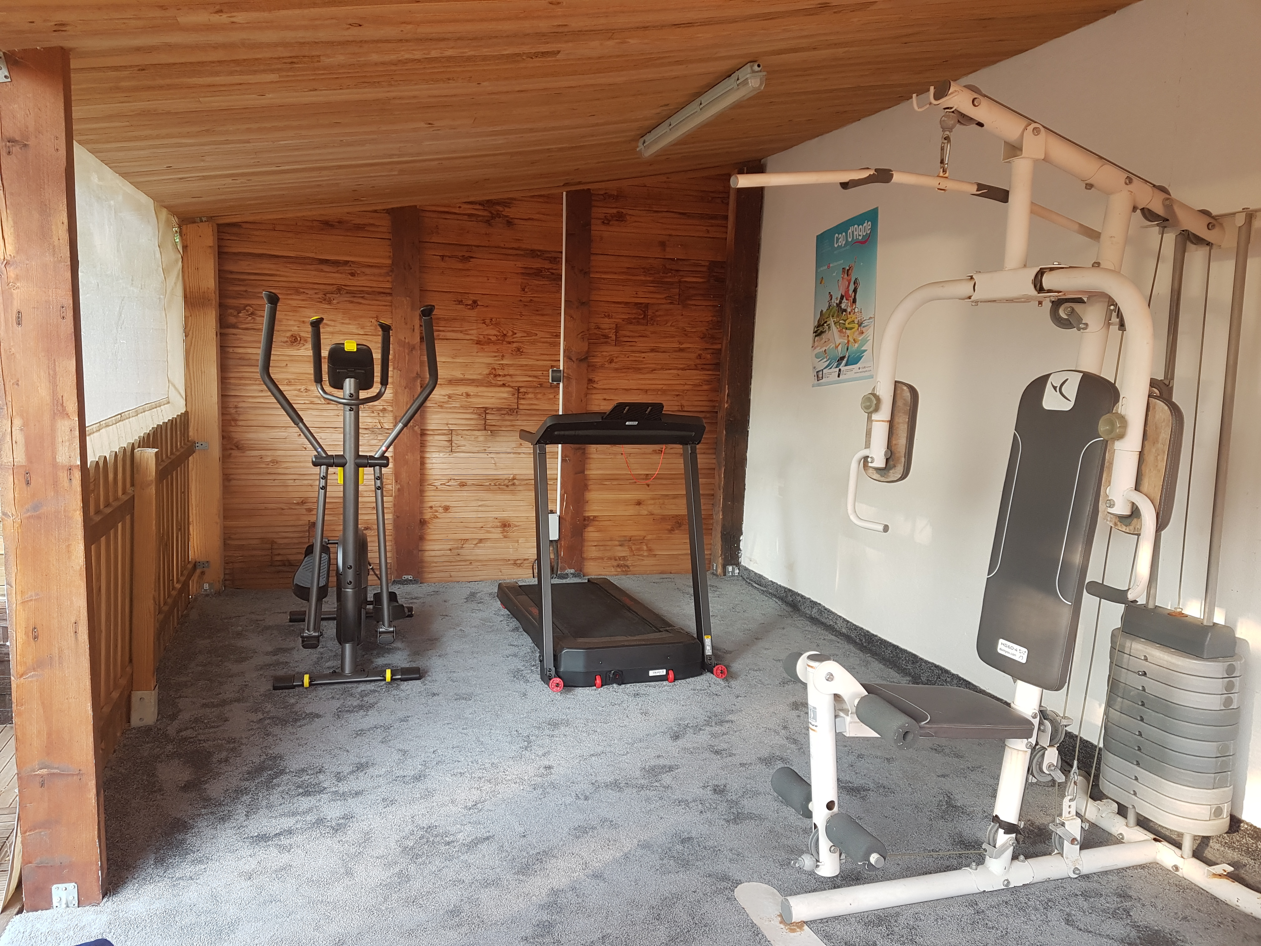 Salle de sport avec tapis de course, vélo elliptique et banc de musculation.