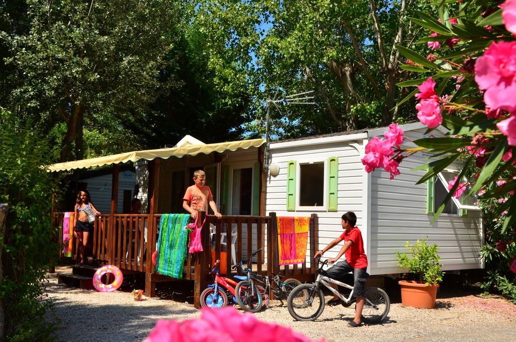 Location de mobil-homes avec terrasse en saison de 2, 4 et 6 personnes avec TV.